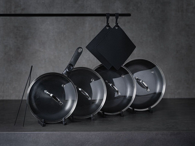 jeder Pfanne sich gegenseitig im Weg stehen. Aber mit unseren ONYX COOKWARE™ GRIFFLOSEN BRATPFANNEN gehört