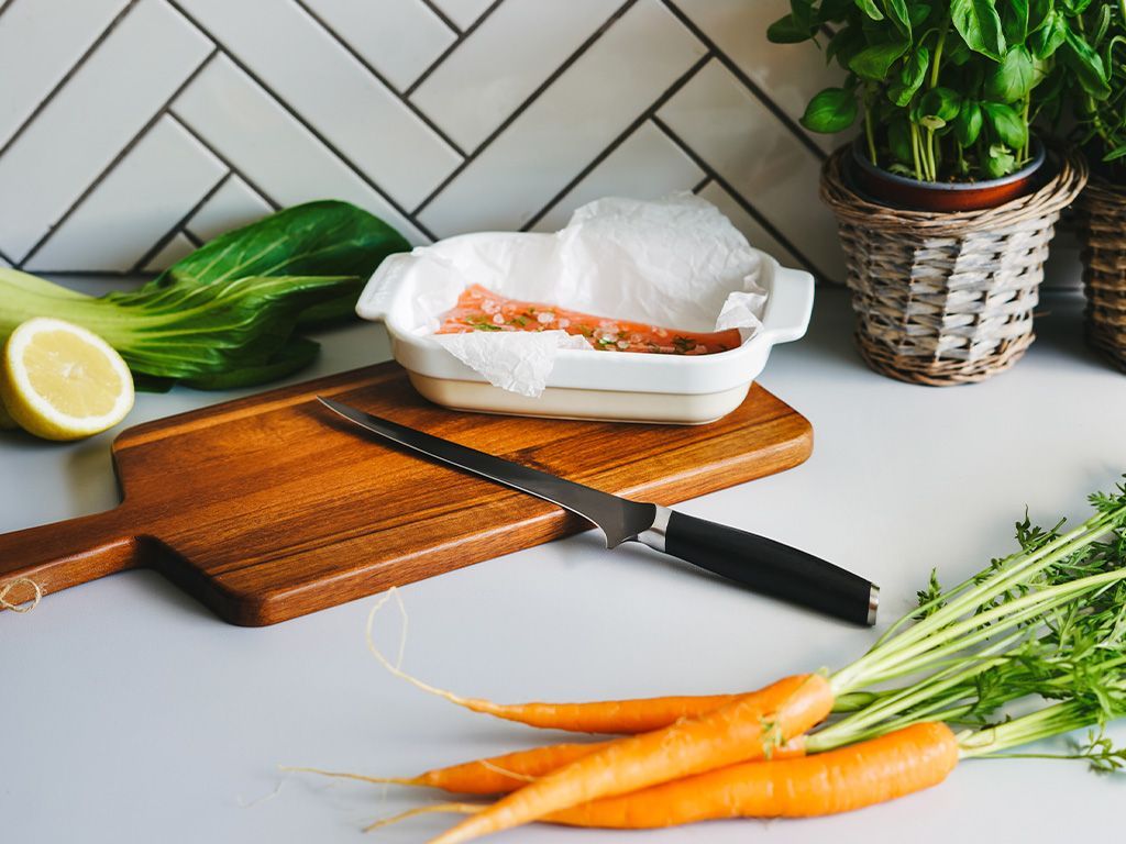 Das Reinigen und Filetieren eines Fisches ist nicht annähernd dasselbe wie das Zerkleinern von harten Knochen und Fleisch. Das Filetieren ist eine viel filigranere und flinkere Arbeit, weshalb es eines speziellen Filetiermessers bedarf. Es erfordert eine Klinge, die flexibel genug ist, um sich zu biegen, aber nicht brechen kann. Aus diesem Grund sollten Sie das ONYX COOKWARE™ FILETMESSER kaufen. Da Fisch im Vergleich zu einem Steak oder anderem dunklen Fleisch eine weichere Fleischsorte ist, ist es unwahrscheinlicher, dass Sie beim Schneiden und Reinigen übermäßig viel Kraft aufwenden müssen. Aus diesem Grund brauchen Sie ein Messer, das Präzision bietet, anstatt eines klobigen Kochmessers, das zum Schneiden festerer Fleischsorten entwickelt wurde.